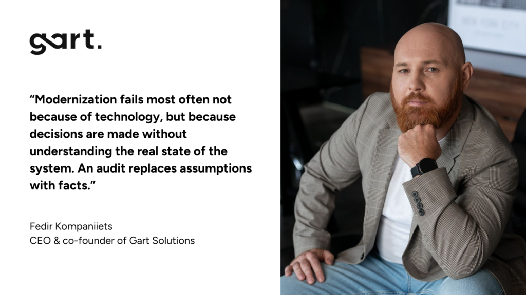 “Modernization fails most often not because of technology, but because decisions are made without understanding the real state of the system. An audit replaces assumptions with facts.”