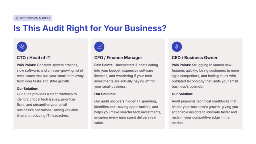 Legacy system challenges affect every role differently. That’s why the audit is designed to speak the language of technical leaders, business owners, and finance teams alike.