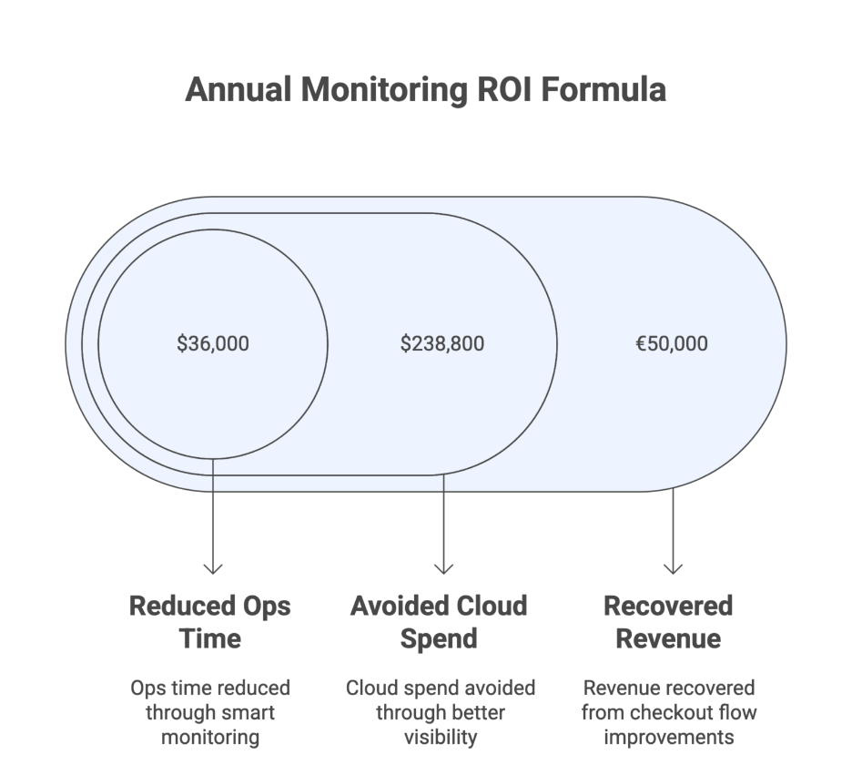 Annual Monitoring ROI = (Recovered Revenue + Avoided Cloud Spend + Reduced Ops Time) – (Tooling + Implementation + Run Costs)